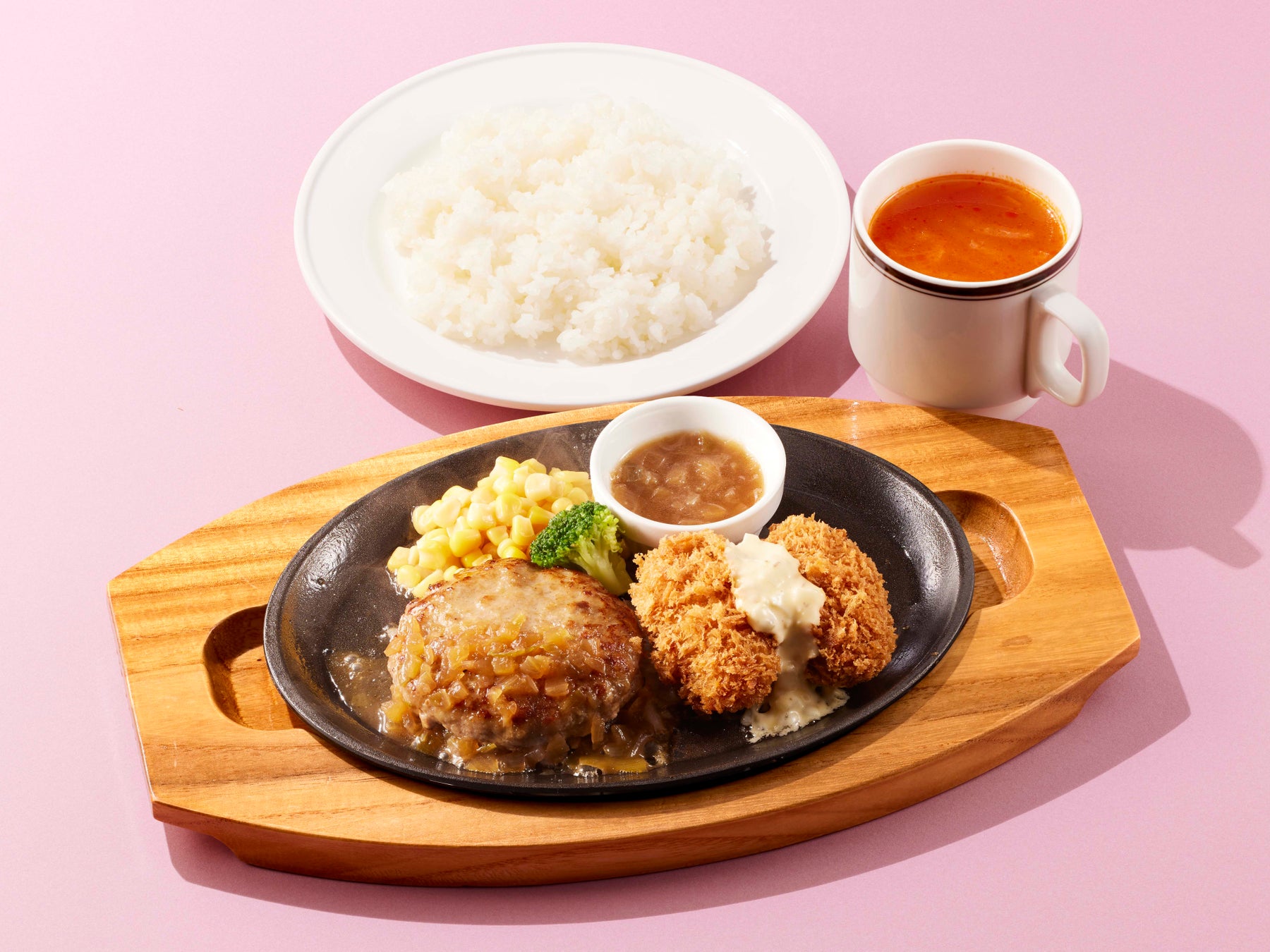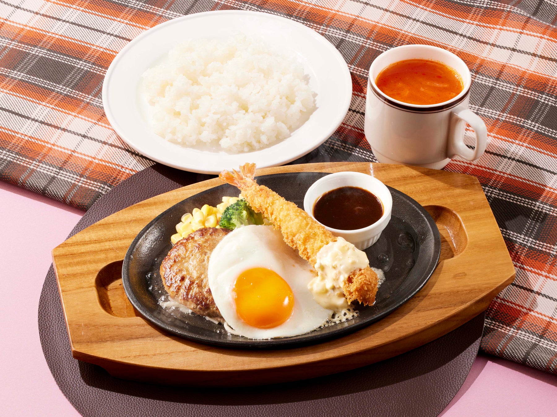 付け合わせのデミグラスソースは、上からかけて熱々の鉄板でぐつぐつさせるのもよし、ハンバーグなどをディップさせるのもよし。幼い頃のワクワク感が味わえること間違いなしの一品です。