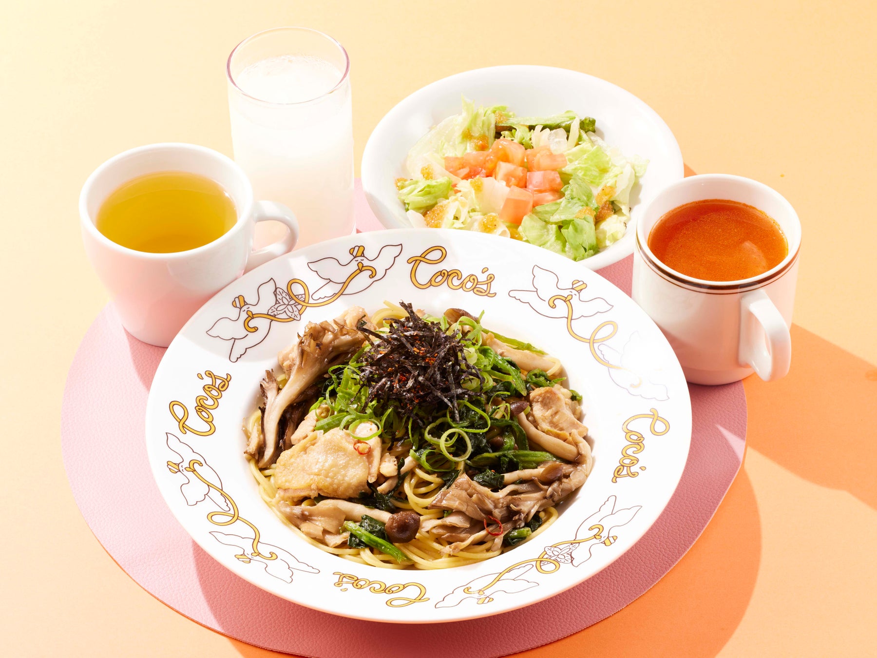 ココスこだわりの本格パスタにサラダ・ドリンクバー・スープバーが付いたお得なセットです。