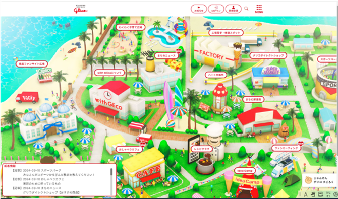「with Glico」は2020年にオープンした Glico の会員コミュニティで、“ココロとカラダの健康”を実現するためのさまざまなコンテンツを用意しています。サイトのデザインは、「街」がモチーフになっており、会員登録をしていただくと、街の「住民」としてすべてのコンテンツを無料でご利用いただけます。また、サイト内では、参加貢献度や参加率に応じて、「ハート」を単位としたポイントが付与され、それらの「ハート」を使って、ファンミーティングやキャンペーンなどへの参加や、プレゼントと交換することができます。