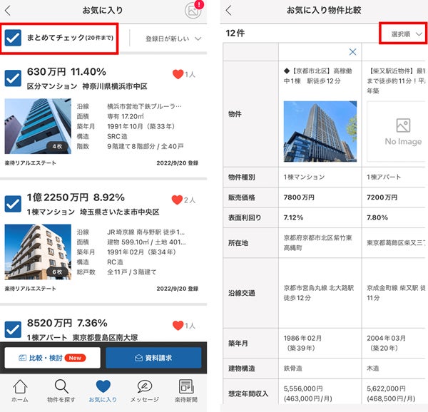 タイパ向上の新機能が楽待アプリに登場!複数のお気に入り物件を同時比較できるように