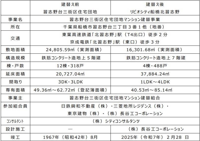 日鉄興和不動産株式会社(本社:東京都港区、代表取締役社長:三輪 正浩)、三菱地所レジデンス株式会社(本社:東京都千代田区、代表取締役 社長執行役員:宮島 正治)、東京建物株式会社(本社:東京都中央区、代表取締役 社長執行役員:小澤 克人)、株式会社長谷工コーポレーション(本社:東京都港区、代表取締役社長:熊野 聡)の4社が参加組合員として事業参画し、習志野台三街区住宅団地マンション建替組合(理事長 新森 博)と共に進めてきた「習志野台三街区住宅団地マンション建替事業」(以下 本事業)において、2025年2月28日に『リビオシティ船橋北習志野』として竣工し、4月24日に権利者の皆さま、5月27日に一般分譲住戸購入者の皆さまに引き渡しをいたしましたのでお知らせいたします。