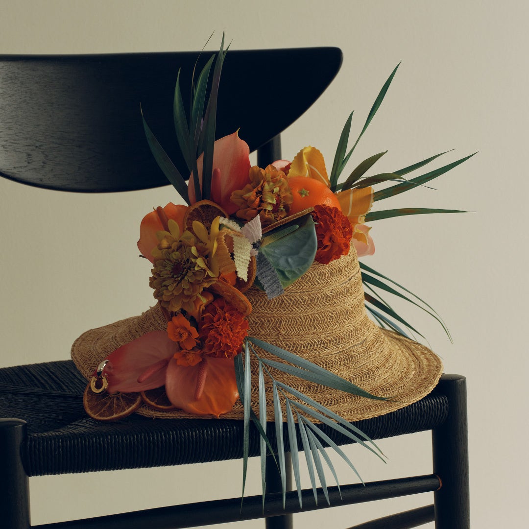 〈サンジョルディフラワーズ ザ・デコレーター〉の装花と〈Firsthand〉の残布や廃棄予定のアクセサリーなどを、〈La Maison de Lyllis〉のハットに装飾したコラボハット。