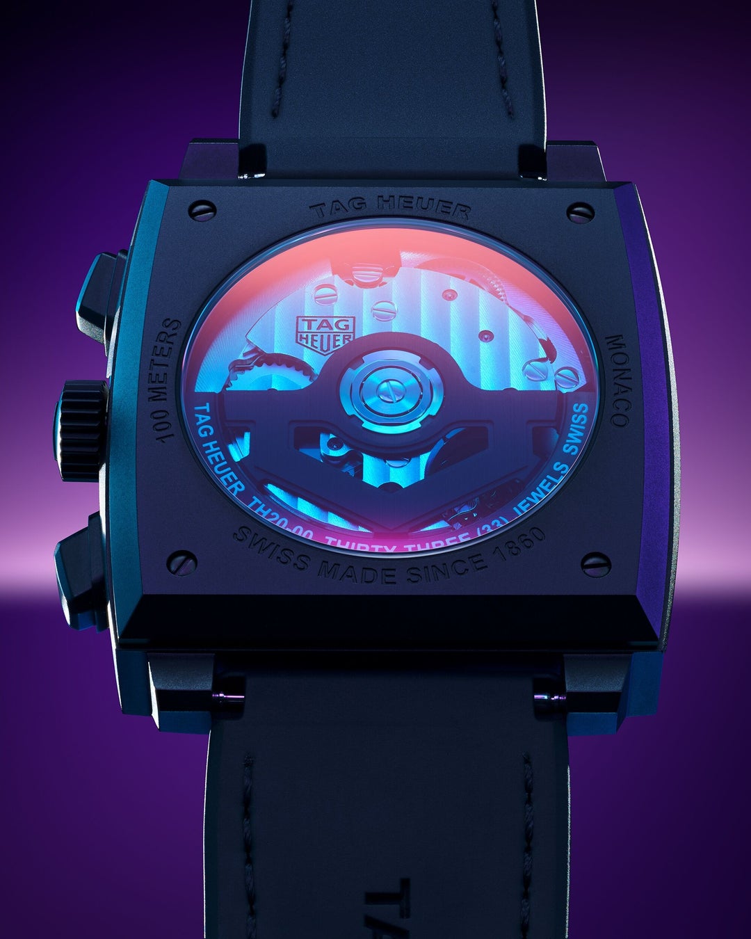 わずか600本のリミテッドエディションのこのモデルは、それぞれに個別のシリアル番号が刻印されています。また、タイムピースに使われているのと同じパープルでアクセントを効かせた特別デザインの「タグ・ホイヤー モナコ」の専用パッケージに収められています。