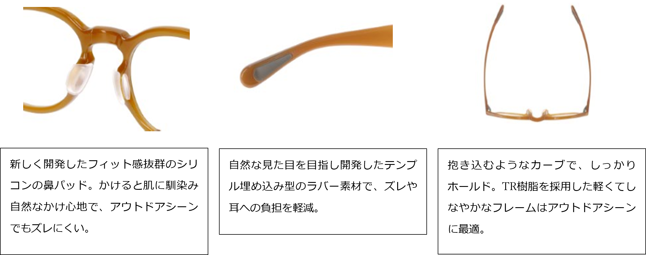 新構造の鼻パッドが、荷物の持ち運びや料理など、意外と動きのあるキャンプシーンでもズレ知らずを実現。