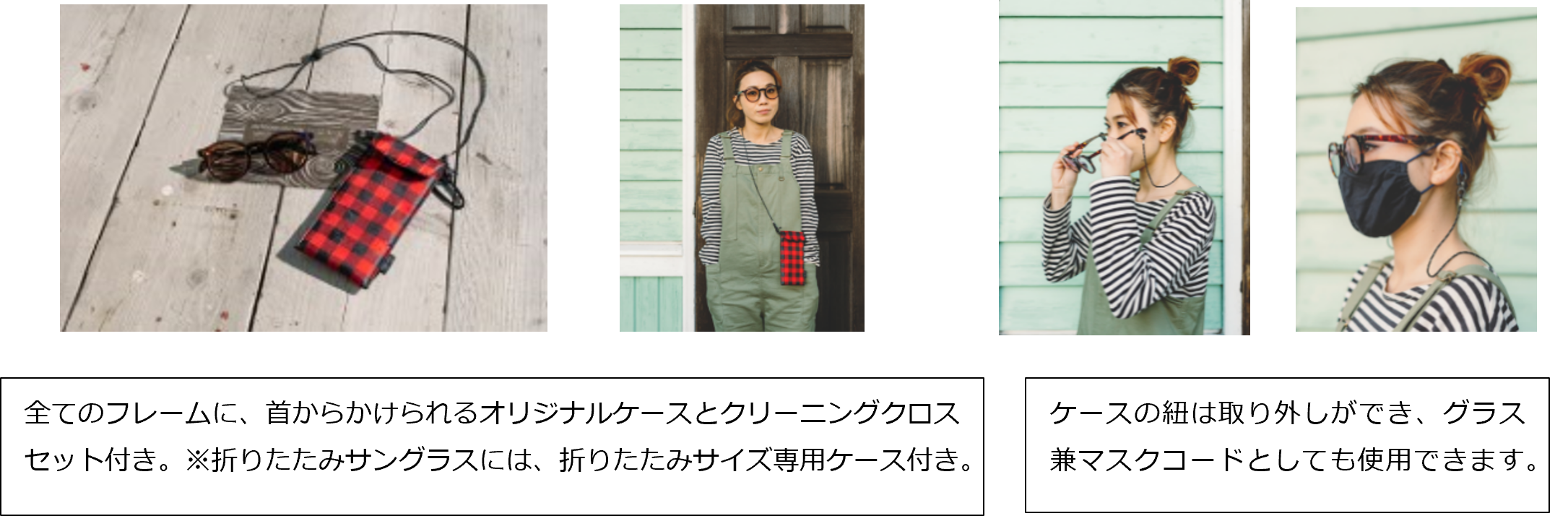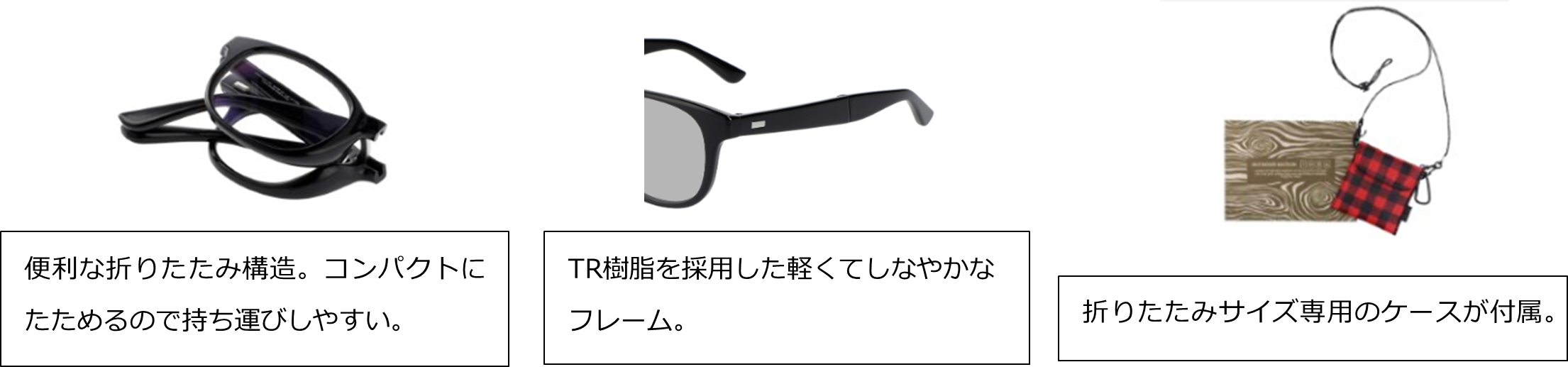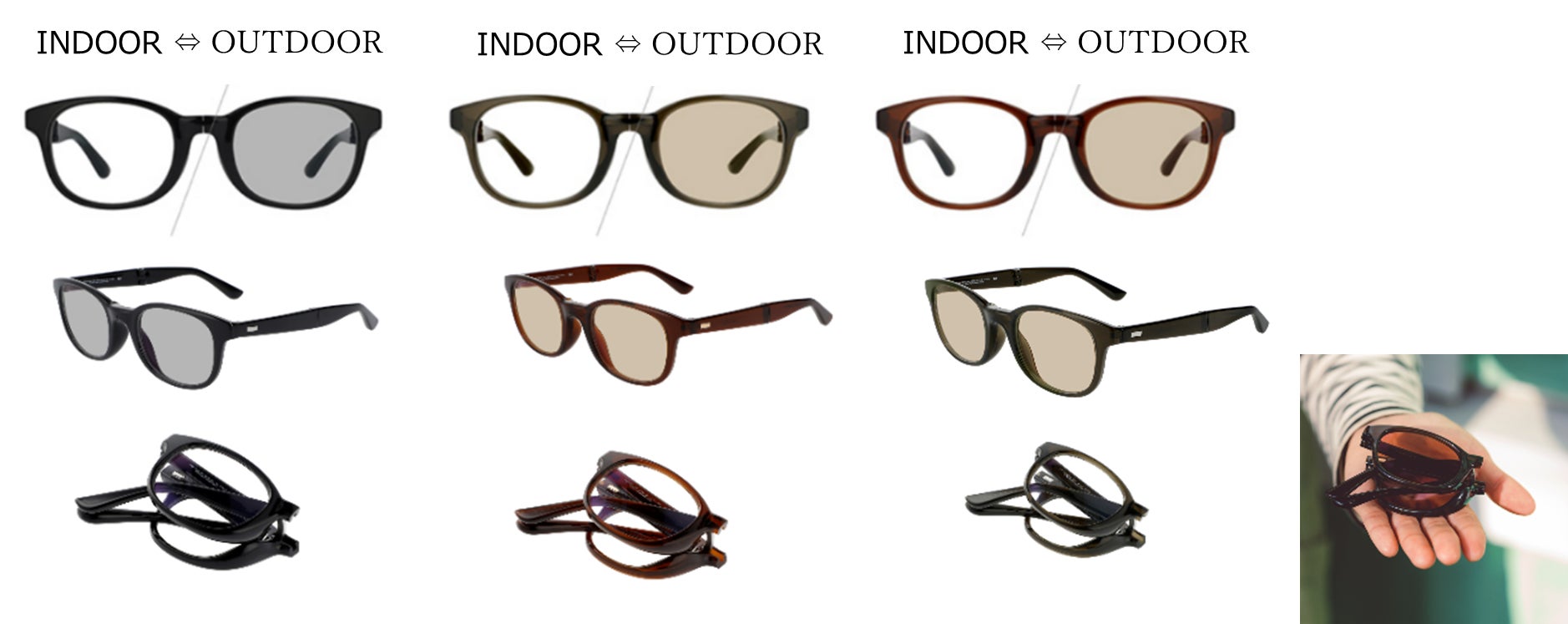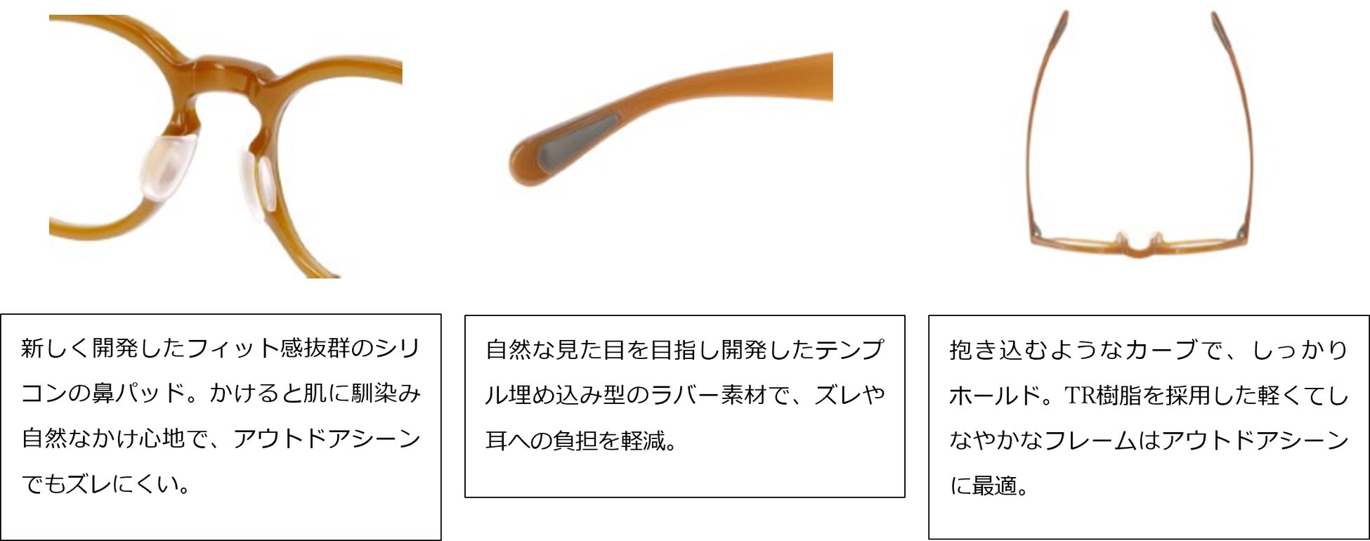 本コレクションでは、前回好評を博した「色が変わるレンズ(調光レンズ)」を全ての型に採用し、グレーまたはブラウンの調光レンズが各モデルに搭載されています。フレーム素材には、軽量素材のTR樹脂(ポリアミド樹脂)を採用し、長時間かけても疲れにくい仕様に。また、ズレを軽減するためにシリコン製やラバー素材の鼻パッド、テンプル(つる)の内側にはラバーを施しました。今回は折りたたみ式タイプも登場。小さなカバンでもコンパクトに収納でき、スマートに持ち運ぶことができます。肩掛けの付属専用ケースまでこだわり、アウトドアシーンではもちろん、日常やタウンユースでも楽しめるコレクションとなっています。