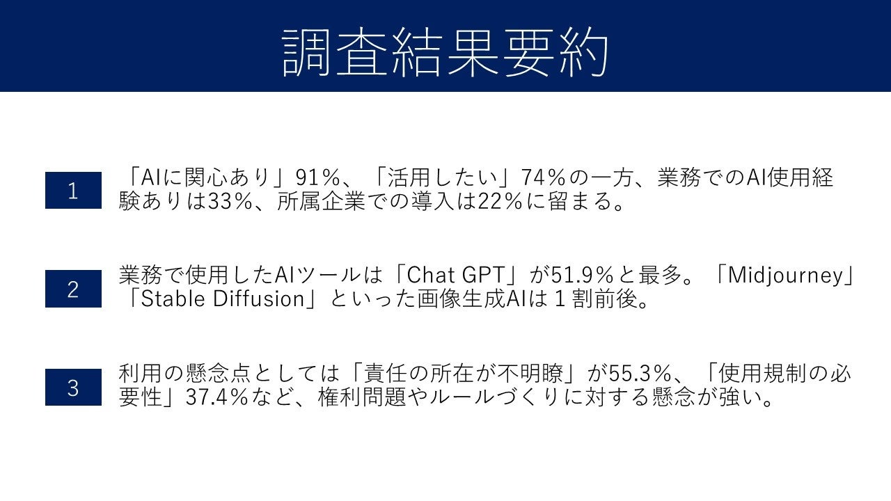 このほか「コピーの案だし」「企画の骨子作成」「社内資料用の画像生成」など具体的なAI活用のシーンや、使用に当たっての懸念など、クリエイターの生の声なども多数寄せられました。