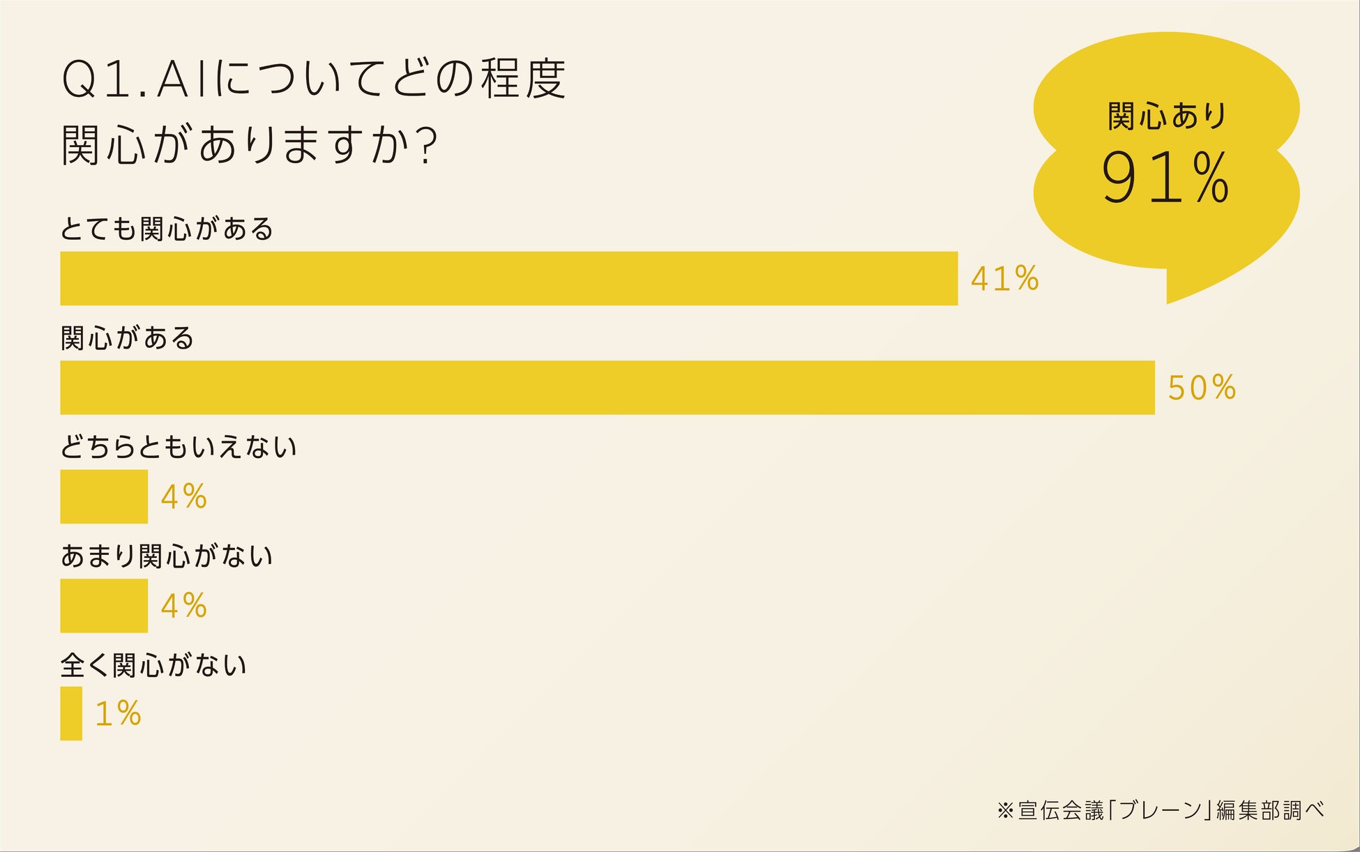 広告・クリエイティブの専門誌『ブレーン』がクリエイターのAI活用実態を調査した結果、「業務での使用経験あり」は33%。「AIへの関心あり」は91%、74%が「AIを活用したい」とする一方で、利用の懸念点として「責任の所在が不明瞭」(55.3%)、「使用規制の必要性」(37.4%)といった声が挙がりました。