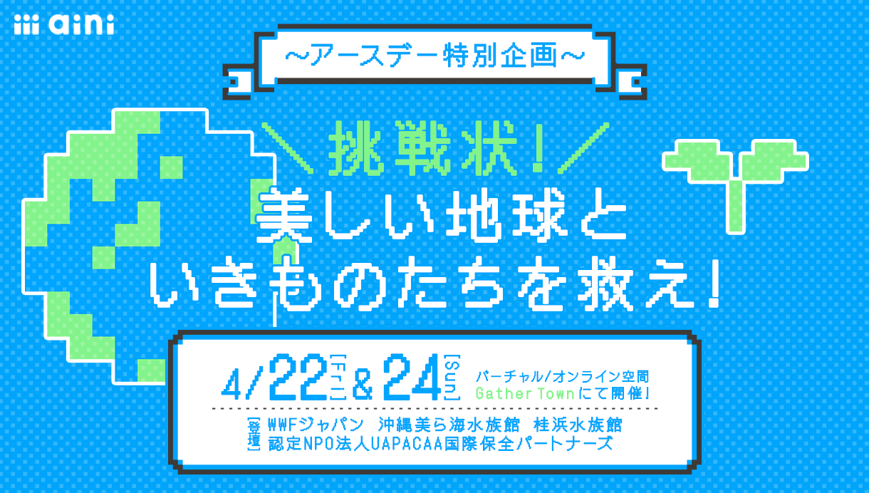 ainiではアースデーを記念し「人と人を繋ぎ、夢中で満たす」というミッションのもと、バーチャル空間で脱出ゲーム「挑戦状!美しい地球といきものたちを救え!」を開催し、参加者同士で協力して様々な謎を解きながら、地球環境について楽しく学ぶ機会を、沖縄美ら海水族館やWWFジャパン (世界自然保護基金ジャパン) ら4団体と共に提供します。