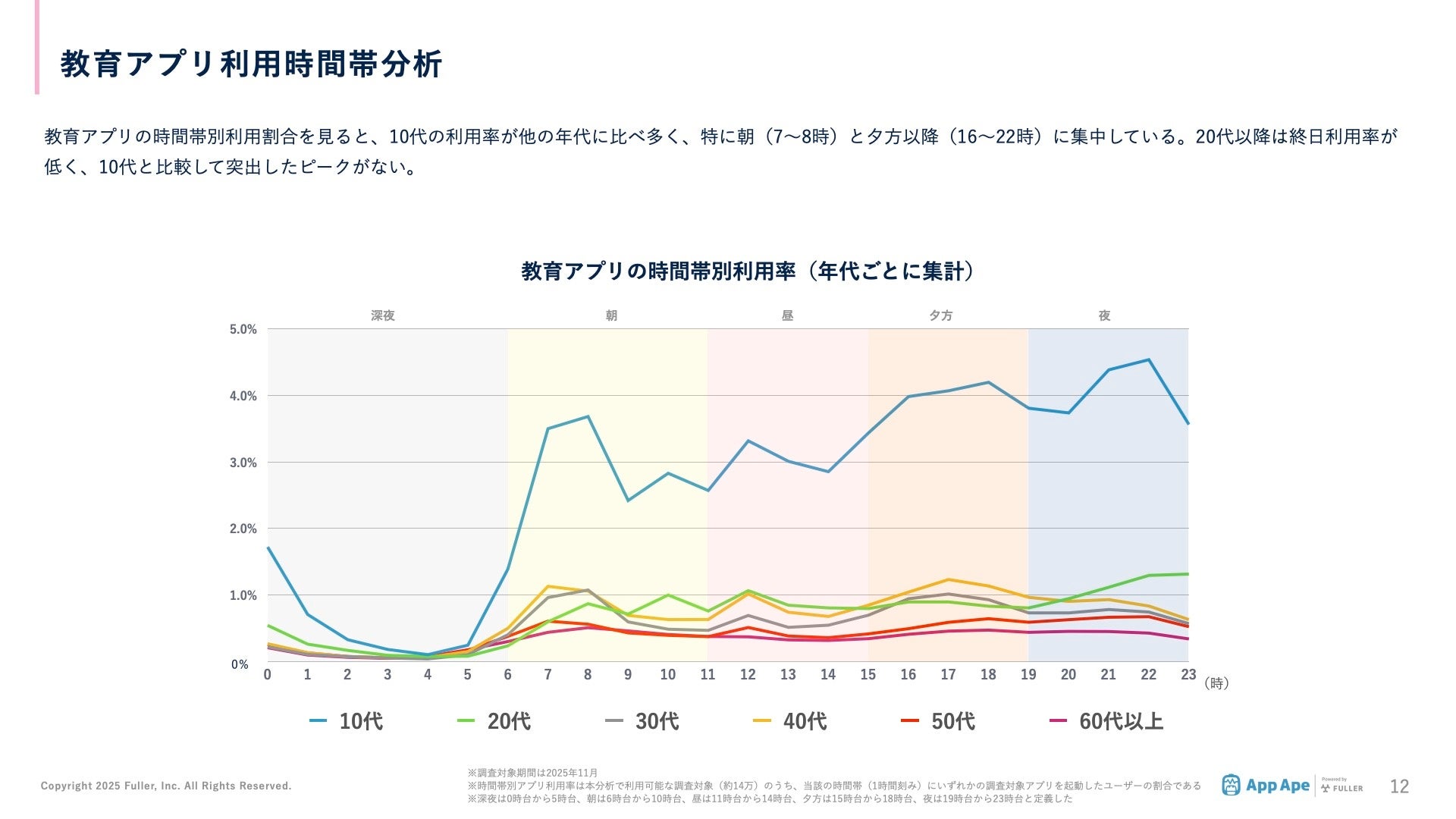 教育アプリは、10代において朝(7〜8時)および夕方以降(16〜22時)の利用率が高く、学校生活や家庭学習と連動した利用が多いことが分かります。一方、20代以降は終日利用率が低く、10代と比較して突出したピークがないことが分かりました。