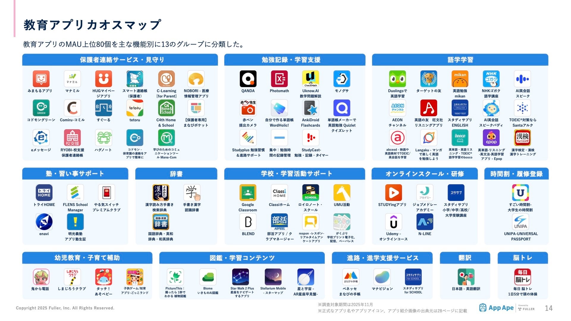 フラー株式会社(本社:新潟県新潟市、代表取締役社長:山﨑将司、以下「フラー」)は、アプリ市場分析サービス「App Ape(アップ・エイプ)」に蓄積されたデータをもとに、 教育アプリの市場動向や利用実態をまとめた「教育・学習アプリ市場調査レポート2025」を公開しました。