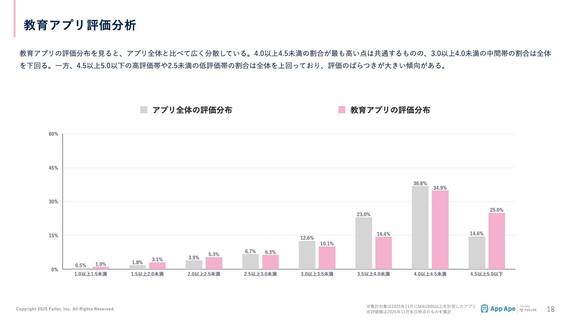 教育アプリの評価分布を見ると、アプリ全体と比べて広く分散しています。4.0以上4.5未満の割合が最も高い点は共通するものの、3.0以上4.0未満の中間帯の割合は全体を下回っています。一方、4.5以上5.0以下の高評価帯や2.5未満の低評価帯の割合は全体を上回っており、評価のばらつきが大きい傾向があります。