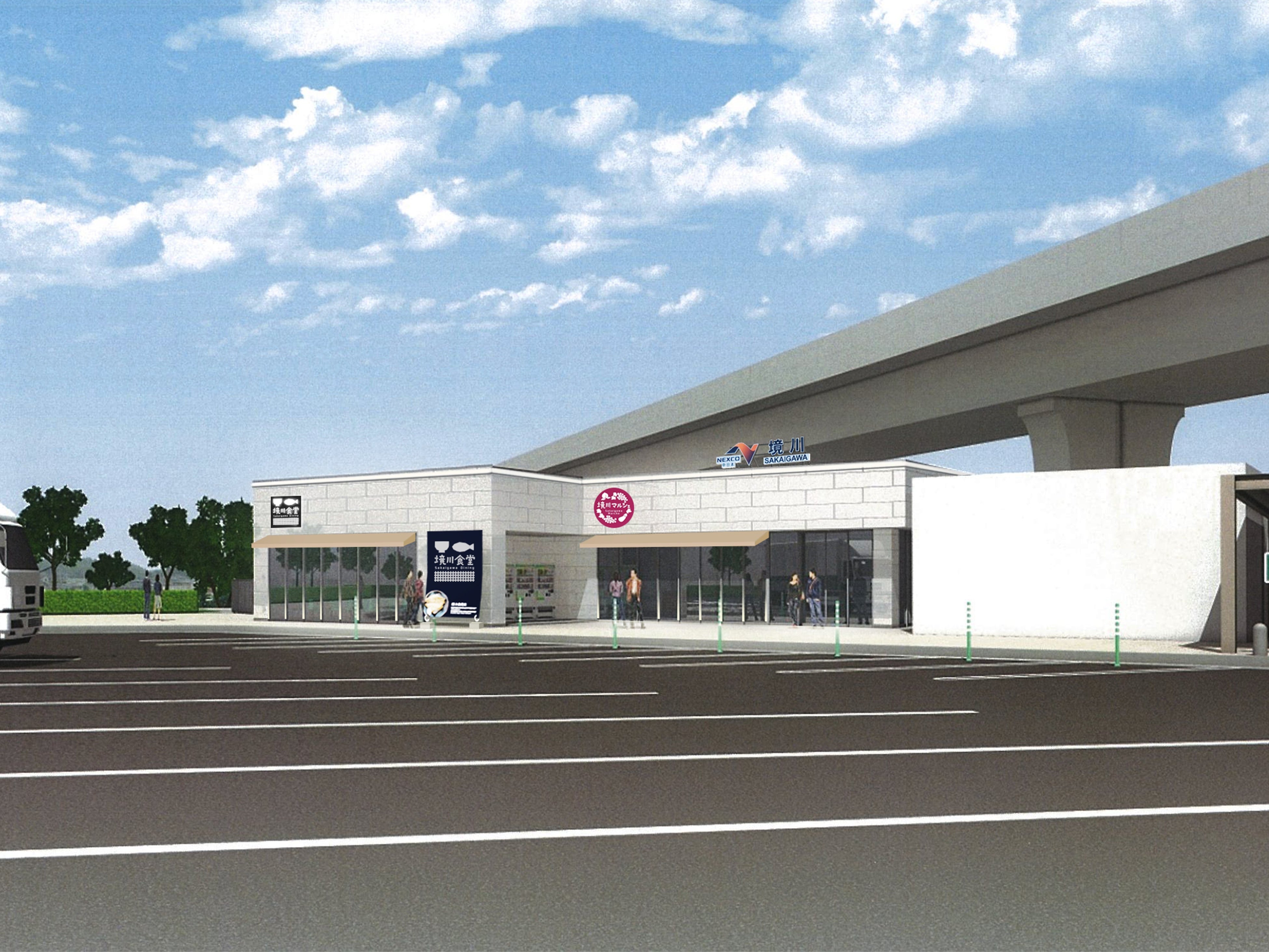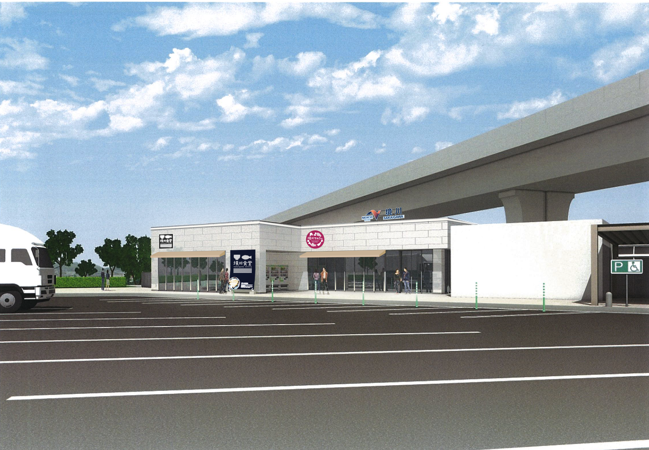 リニア中央新幹線の高架橋が境川PA(上り)の商業施設の上空を通過する計画であることから、これに協力するため、PA内の西側に新たな商業施設を設置するものです。今回のリニューアルで、施設規模は1.6倍に拡充し、リニアのスタイリッシュな車体をイメージした光沢のある白色の施設に生まれ変わります。