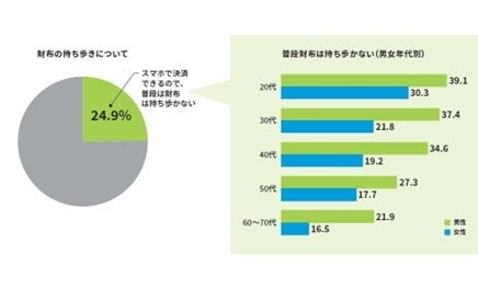全年代において、6割がキャッシュレス派と自認し、現金で買い物をする人の方が少数派になりつつある現状が浮き彫りとなりました。4人に1人は普段から財布を持ち歩かないことがわかり、特に、20代男性は約4割が「普段から財布を持ち歩かない」と回答しています。