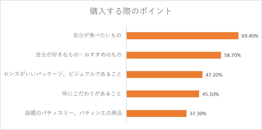 今回の意識調査では「バレンタインギフト」を贈る個数も金額も、ほぼ増加傾向が見られました。特に「相手別1個当たりの購入予定金額平均」では、「本命・パートナー」よりも「自分」が最も高額となり、昨年から400円弱のアップという結果に。また、チョコレートを選ぶポイントでも、「自分が食べたいもの」や「自分がおすすめのもの」が半数を超えていました。