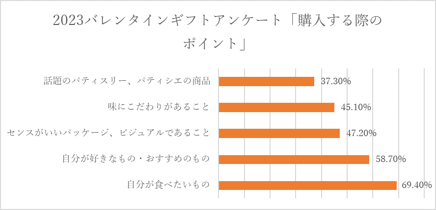 「自分」好みや希望のチョコレートを購入予定のユーザーが最も多い結果に。選ぶ楽しさもバレンタインの醍醐味のひとつになっています。