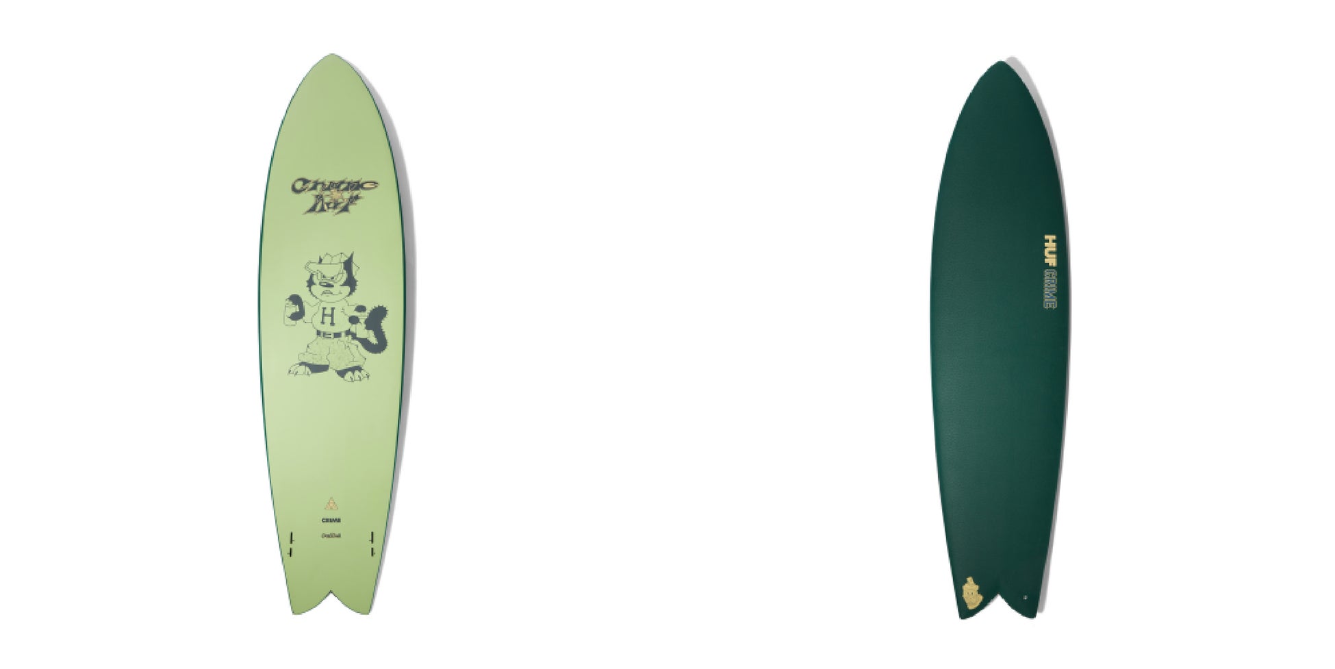 90年代、サンフランシスコのエンバカデロ・プラザは、当時のスケートボーダー達の実験場のようなスポットであり、様々な人種のローカルや移住者達が現代のストリートスケートスタイルの基盤を築き上げました。HUFの創設者であるキース・ハフナゲルと、Crimeの創設者のCJ Nelsonは、この場所で初めて出会い長年の友情を育み、HUF初となるサーフボードのコラボレーションが今回実現しました。HUF X CRIMEは、当時のSFの溢れるエネルギーとクリエイティビティーが生み出したもので、この時代のストリートカルチャー、スケートボード、アート、ミュージックなどに影響を受けたキャップやTシャツに加え、オリジナルアートを施したオールコンディションサーフボードで、両ブランドのヘリテージを表現しています。