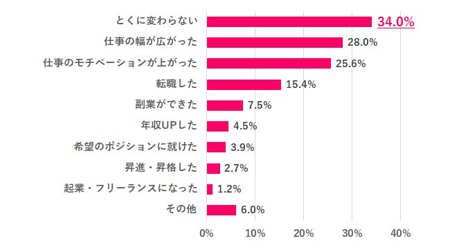 リスキリング経験がある人に、リスキリングに取り組んだ結果どのような変化があったかを尋ねると、最も多かったのは「とくに変わらない」34.0%ですが、2位「仕事の幅が広がった」28.0%、3位「仕事のモチベーションが上がった」25.6%と、プラスの変化が見られた人もいました。