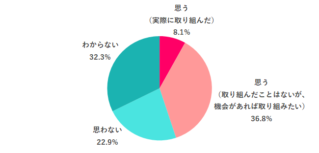 産休・育休中に、リスキリングに取り組みたいと思うかどうかについては、「思う(取り組んだことはないが、機会があれば取り組みたい)」が最も多く36.8%でした。「思う(実際に取り組んだ)」は8.1%で、合わせると約45%の人が取り組むことに前向きであることがわかります。
