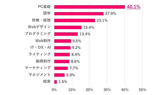 リスキリング経験がある人に、どのようなリスキリングに取り組んだことがあるかを尋ねると、1位「PC基礎」40.1%、2位「語学」27.9%、3位「財務・経理」23.1%と続きました。
