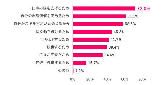 リスキリングが必要だと思う理由は、1位「仕事の幅を広げるため」72.0%、2位「自分の市場価値を高めるため」61.1%、3位「自分がスキル不足だと感じるから」58.3%となりました。