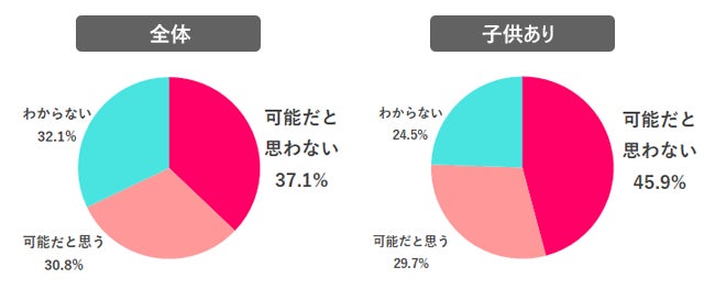 産休・育休中のリスキリングは可能だと思うかどうかを尋ねたところ、最も多かったのは「可能だと思わない」37.1%でした。子供がいる人だけの場合、「可能だと思わない」は45.9%とさらに高くなりました。