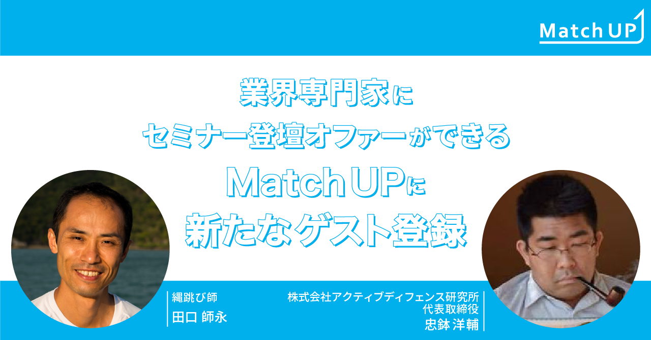 業界専門家にセミナー登壇オファーができる「Match UP」縄跳び師 田口 師永氏、株式会社アクティブディフェンス研究所 忠鉢 洋輔氏が新たにゲスト登録