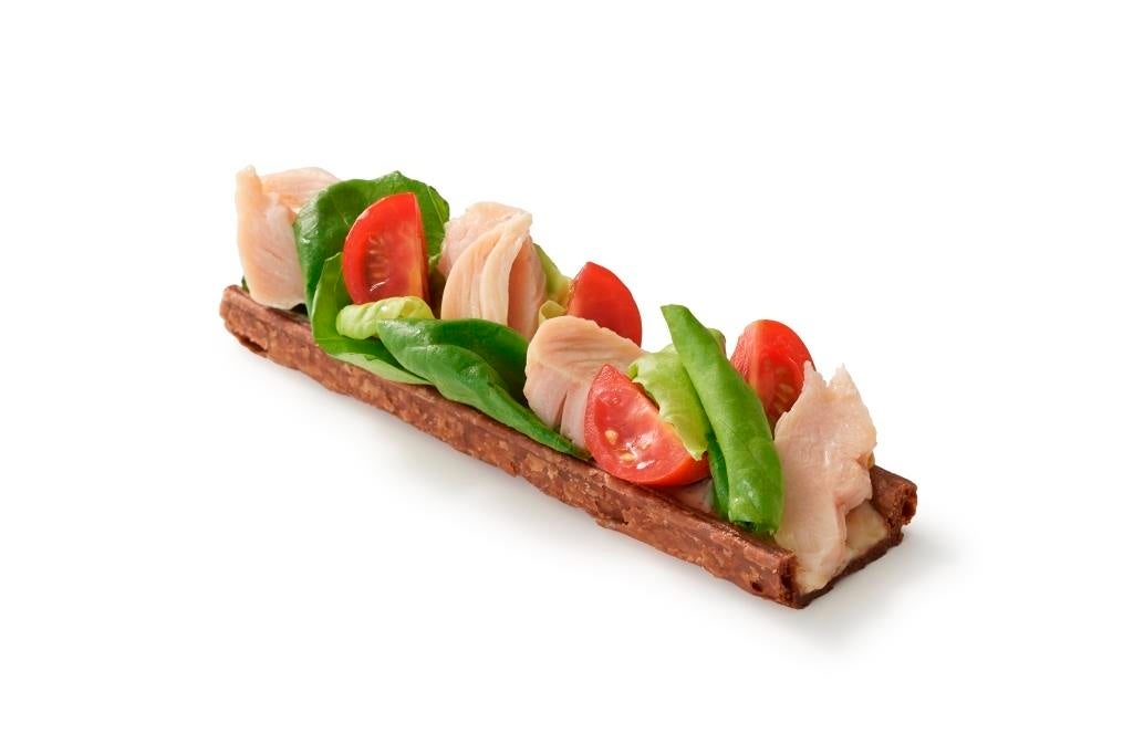 ベルギーのオープンサンド「タルティーヌ」をゴディバ流にアレンジ。薄く焼き上げたチョコレートパイにトマトやサラダ菜、サラダチキンをにぎやかにのせました。