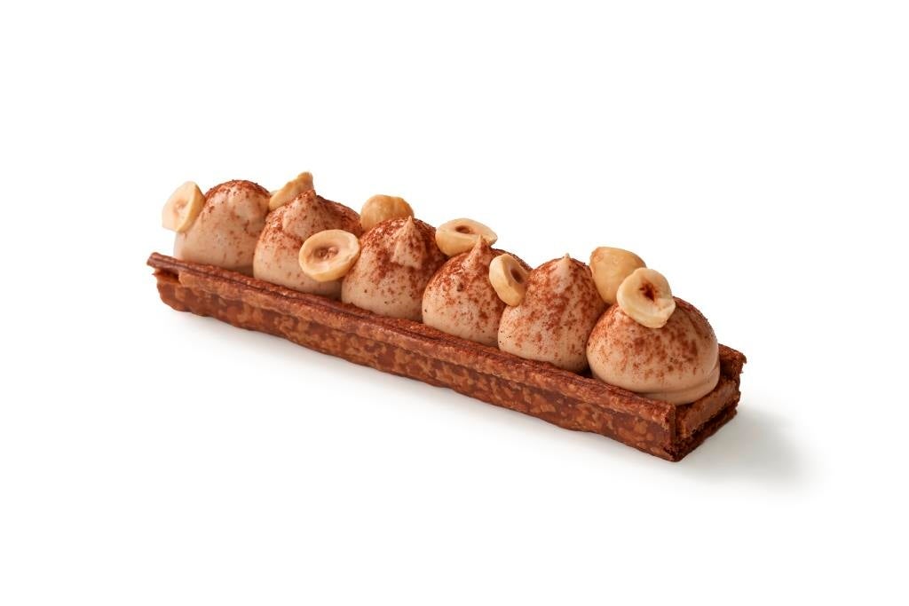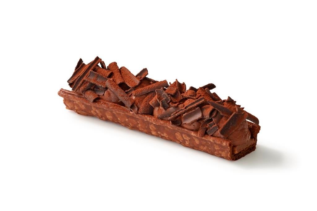 チョコレートパイを使ったゴディバ流タルティーヌ。ナッツが香るジャンドゥーヤプレートに、ヘーゼルナッツプラリネとカスタードを合わせたクリームを絞りました。