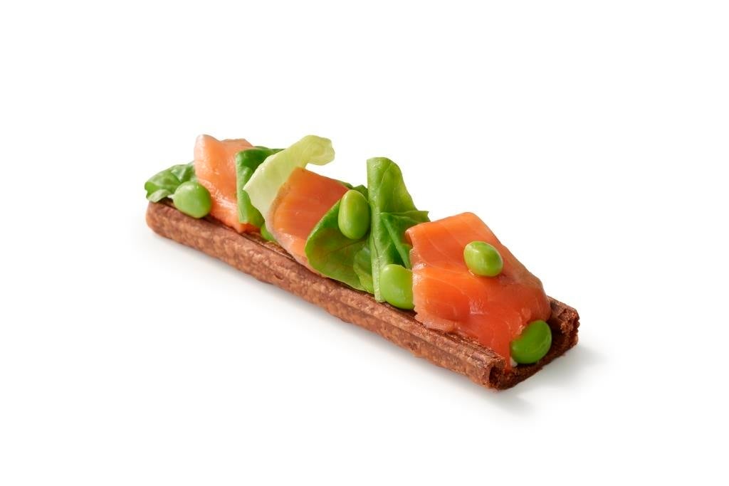 ベルギーのオープンサンド「タルティーヌ」をゴディバ流にアレンジ。薄く焼き上げたチョコレートパイにマスカルポーネクリーム、枝豆、スモークサーモンのサラダをのせました。