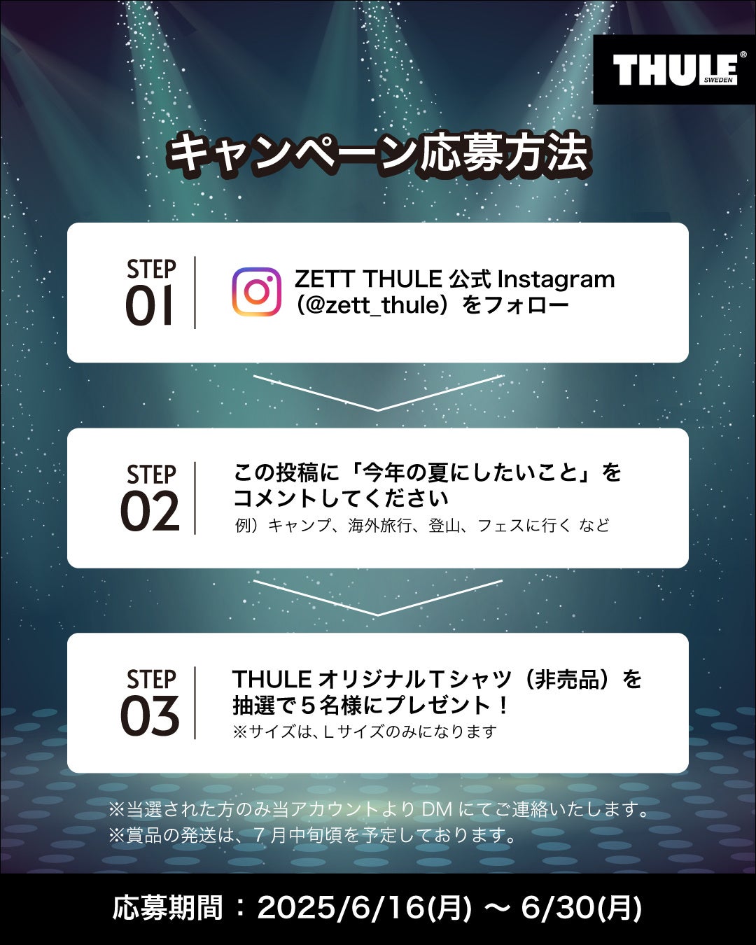 ZETT THULE公式インスタグラムアカウント(@zett_thule)のフォロワー様限定企画で、キャンペーン投稿に「あなたが今年の夏にしたいこと」をコメントしてくれた方の中から抽選で5名様にプレゼントいたします。