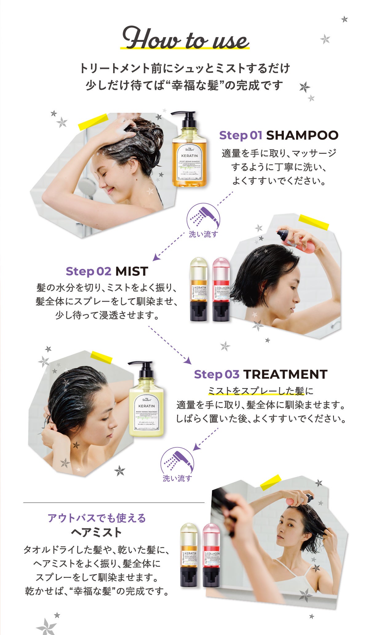 *3加水分解ケラチン(羊毛)〔毛髪補修成分〕*4 シクロヘキサン-1,4-ジカルボン酸ビスエトキシジグリコール〔保湿成分〕*5 髪の内部まで *6加水分解コラーゲン〔毛髪補修成分〕