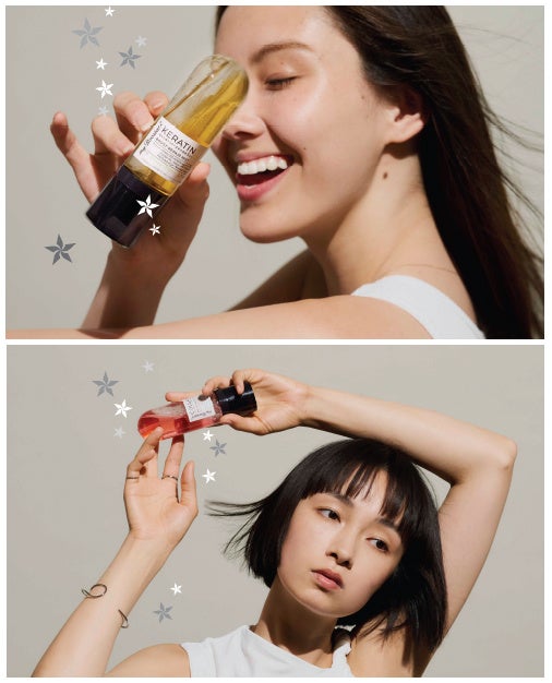油と水、二層に分かれた美容液成分。油層にはホホバ種子オイル、スクワランをはじめとする美容液成分を。水層にはケラチン or コラーゲンを。水と油、両方の要素があることで、髪の内部までダメージケアしながらうるおいを与えてくれます。