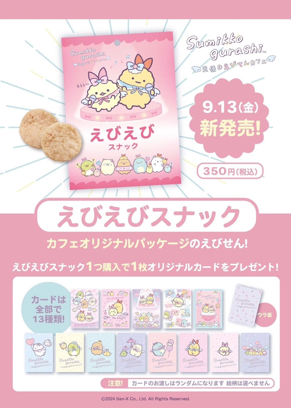 『天使なえびてんカフェ』は、すみっコぐらしの新キャラクター「えびてんのしっぽ」の登場を記念し、2024年8月30日(金)より、渋谷・大阪にて開催されており、キャラクターをイメージしたメニューやそのかわいらしい見た目が人気を博しています。渋谷では10月14日(月・祝)まで、大阪では10月6日(日)まで開催されます。
