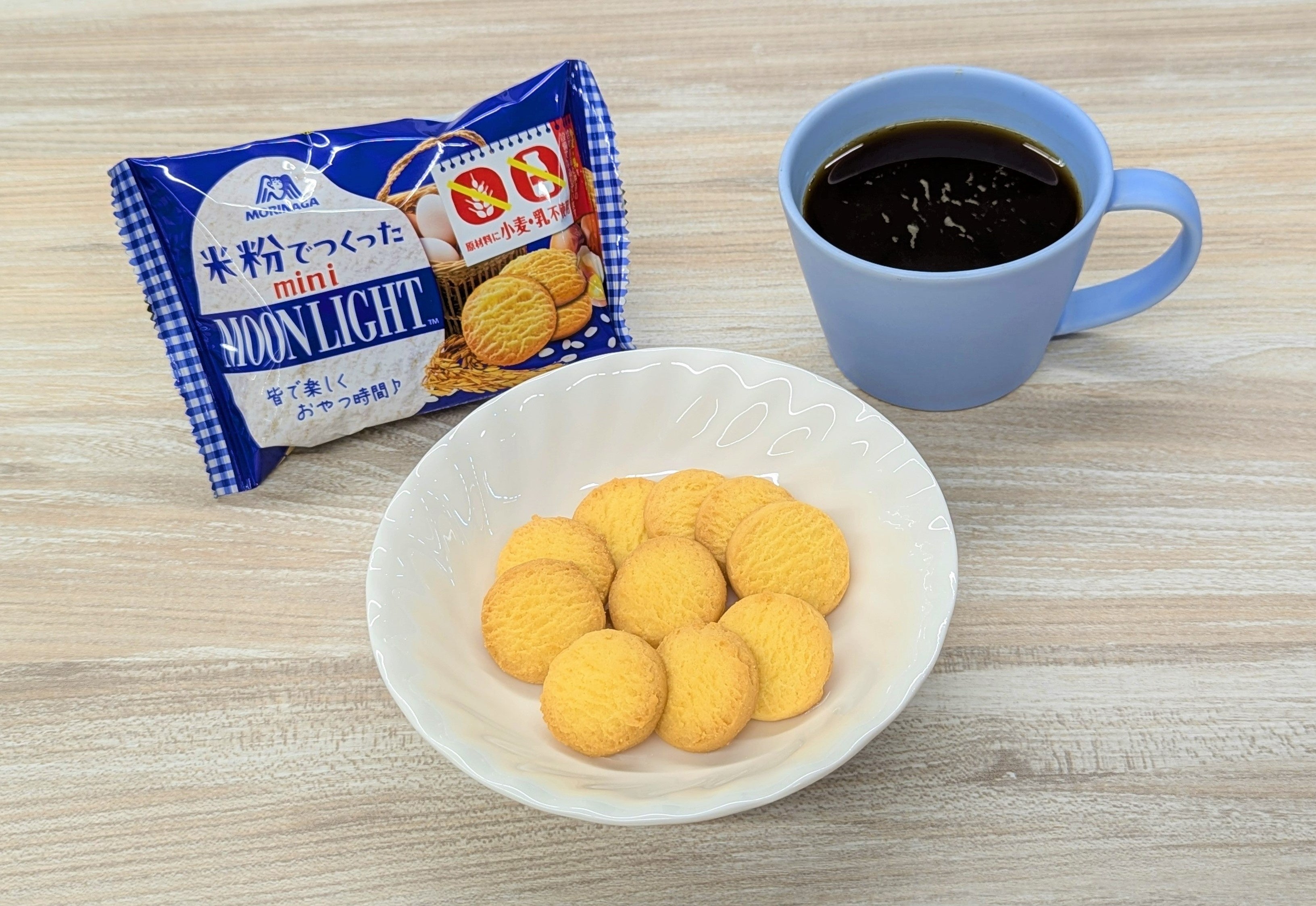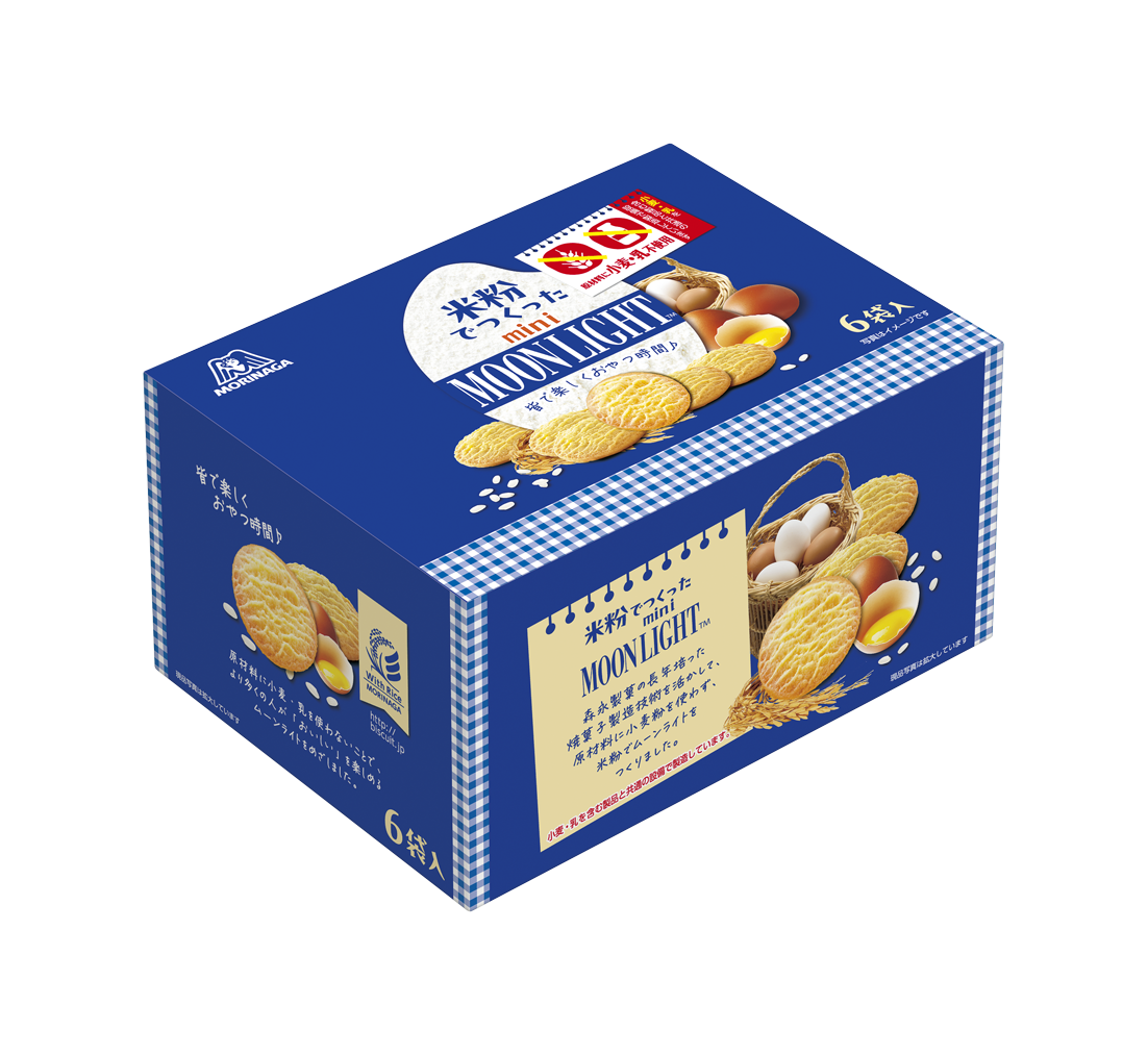 1960年発売の「ムーンライト」は、「森永ビスケット」シリーズの中でも人気の当社を代表する主力商品です。食物アレルギーの方が多い「小麦」「乳」を原材料に使わずに※「ムーンライト」ならではのふんわりまろやかな卵の味わいはそのままに、サクサク食感を楽しめる一口サイズの焼菓子「米粉でつくったミニムーンライト」を開発しました。より多くのお客様が「おいしい」を楽しめる本商品の発売により、お客様のウェルネスライフをサポートしてまいります。
