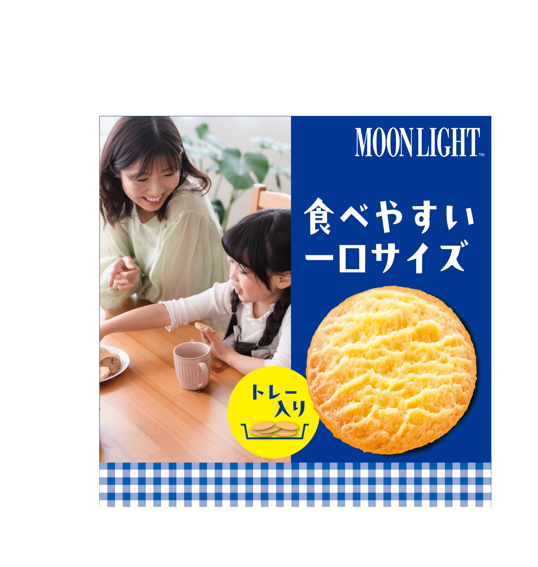 ・「ムーンライト」のイメージを表現するとともに、米粉でつくっていることをお米の形のロゴとともに伝えることで、親子一緒に楽しんでいただけるようなデザインを目指しました。