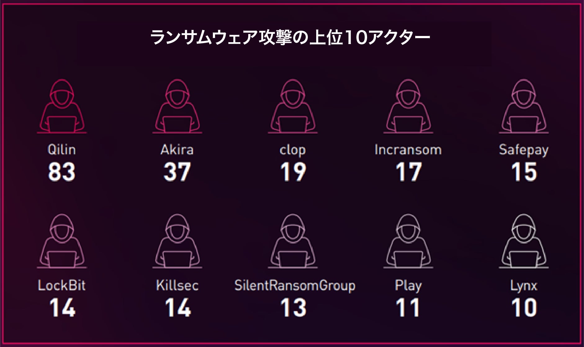 ランサムウェア脅威活動はごく少数の攻撃者グループに集中しており、Qilin(83件/18.4%)が最多で、Akira(37件/8.2%)、Clop(19件/4.2%)がこれに続きます。これらのグループは共有ツール、高度にモジュール化されたマルウェア、そして高度に組織化されたアフィリエイトネットワークを活用し、攻撃を迅速かつ効率的に拡大します。多重恐喝の手口の多用によって被害は深刻さを増しており、重要システムの暗号化にとどまらず、規制当局への報告義務や顧客への通知、評判の毀損、さらには上級管理職を標的とした嫌がらせまでが圧力手段として用いられています。こうした複合的圧力は財務面および評判面に連鎖的な影響を及ぼし、バックアップや復旧といった従来の戦略は依然重要ではあるものの、対策として十分ではなくなっています。