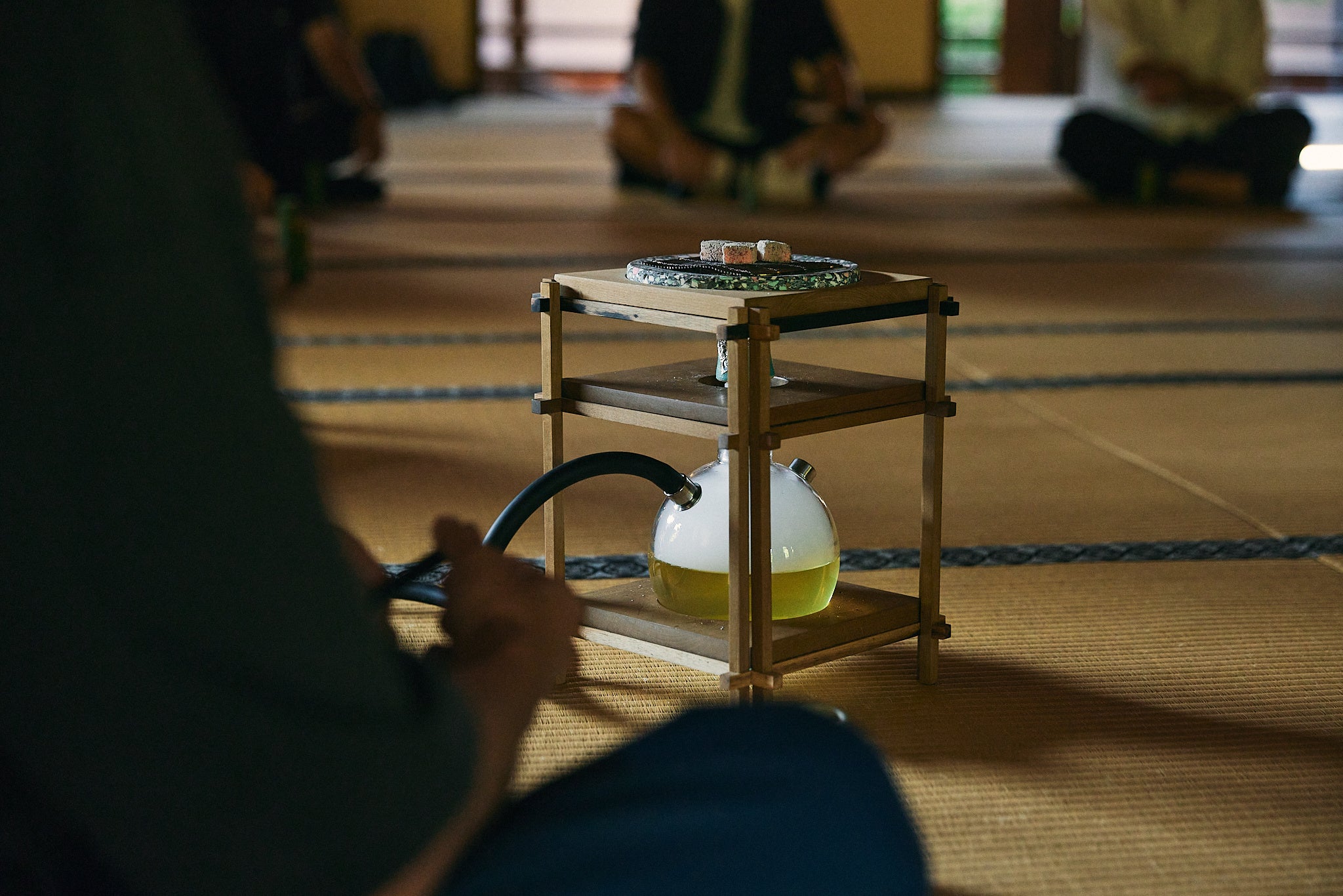 両足院で行われたDayレセプションでは、京都を拠点に活動するアートコレクティブ「Ochill(オチル)」がプロデュースした「吸うお茶会」を実施。「吸うお茶会」とは、水タバコの原理を応用し、タバコ葉ではなく茶葉を使ったノンニコチンの嗜好体験です。招待客には、“気化”した茶葉の香りや味わいに包まれる新感覚の茶会を楽しんでいただきました。