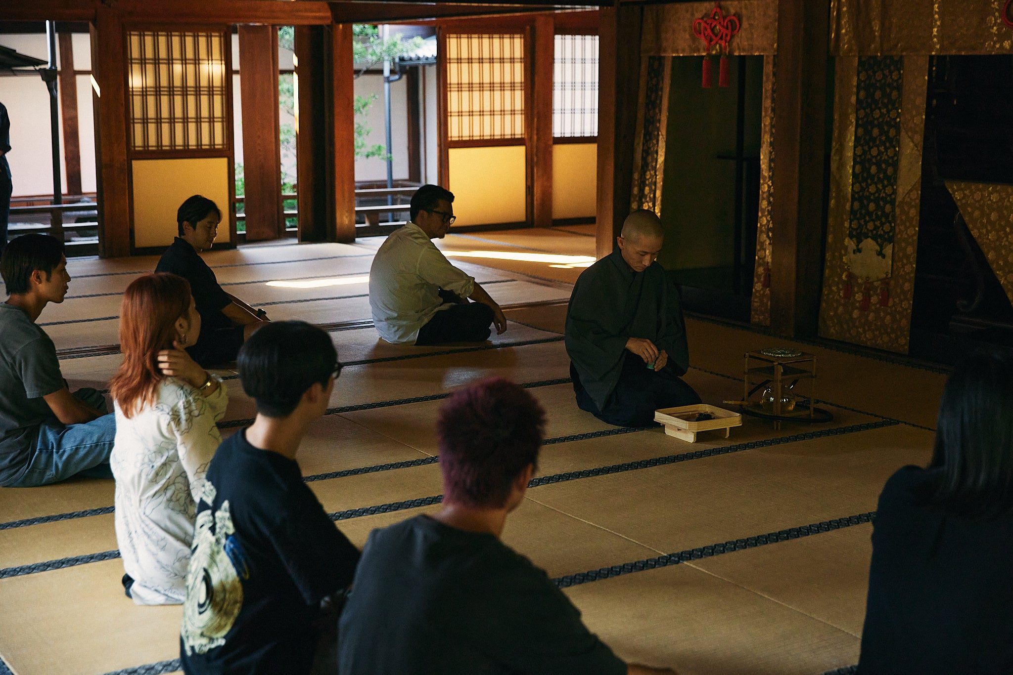 その後は、「AUGER」アンバサダーを務める俳優・板垣李光人さんも参加し、『Forbes Japan』にて「Next100」に選出された同寺院の副住職・伊藤東凌さんの指導のもと、デジタルデバイスから離れて自分の内面と向き合う座禅・瞑想体験を行いました。「座禅や瞑想をすると、感情のスイッチをオフして自分の心と距離を取ることができます。それにより、自分自身の感覚も研ぎ澄まされ、心身のバランスを整えることに繋がるんです」と伊藤東凌さん。