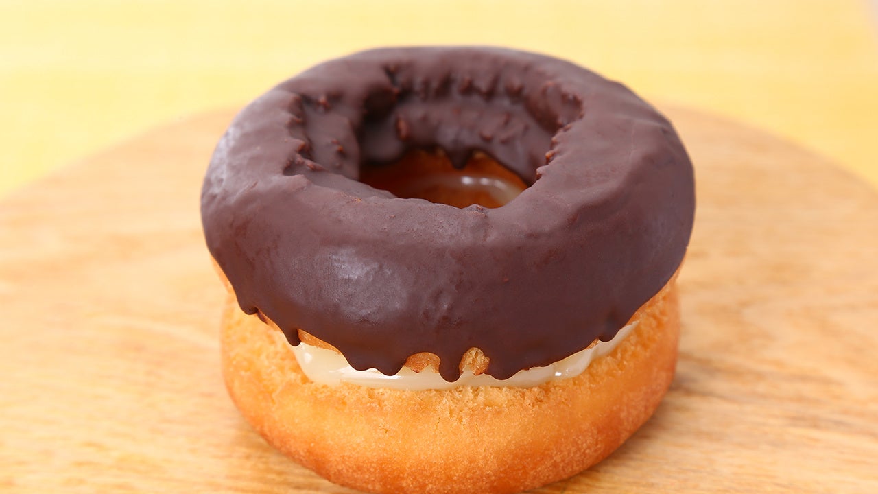 オールドファッションドーナツ2個で練乳クリームをサンドし、チョコを掛けました。1,000kcal超えのカロリーシリーズです。