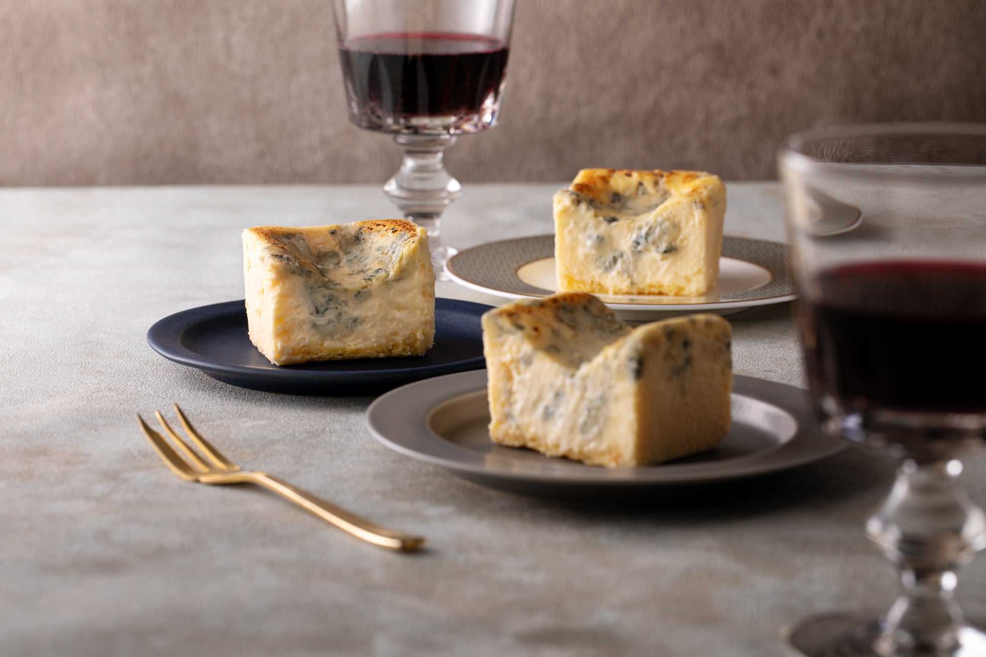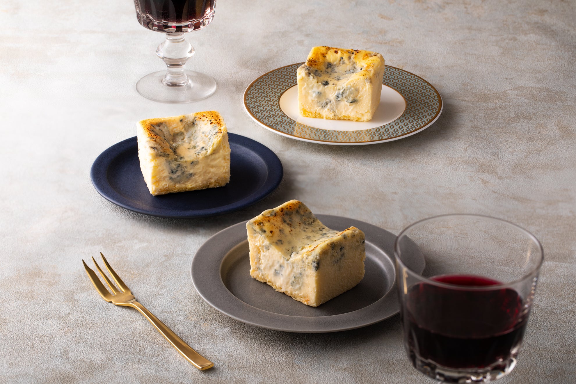 ゴルゴンゾーラを使用した定番の”青”、50%ゴルゴンゾーラを増量した濃厚な”濃い青”、ブルーチーズの王様”ロックフォール”。3種類のそれぞれ異なったブルーチーズケーキをお手軽にお楽しみいただけます。