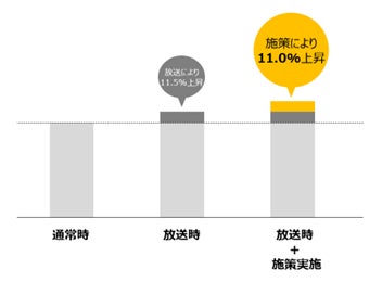 本実証実験の結果、商品がテレビで放送されることで放送から2週間以内の対象商品の販売点数が11.5%増加し、施策実施店舗においてPOPの提示を行うことで更に11%増加することが確認できました。