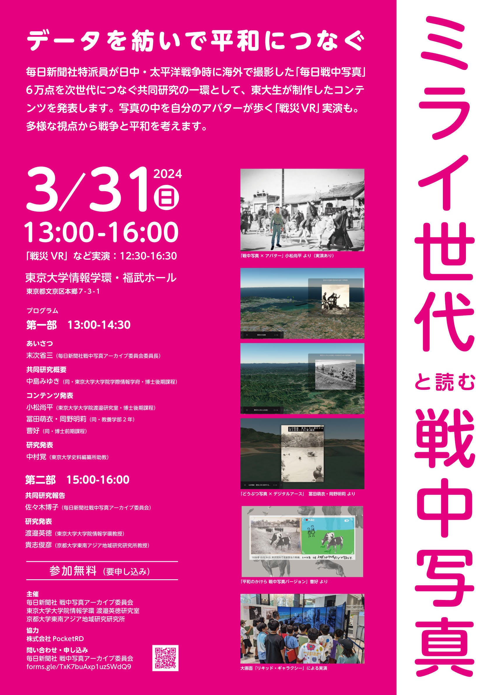 【戦中写真】 毎日新聞社×東大×京大イベント「ミライ世代と読む戦中写真~データを紡いで平和につなぐ~」 3月31日(日)、東大・福武ホールで開催