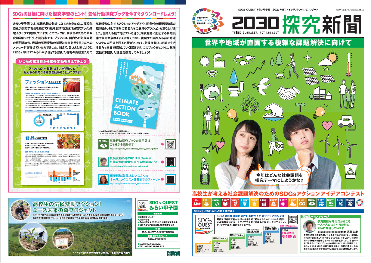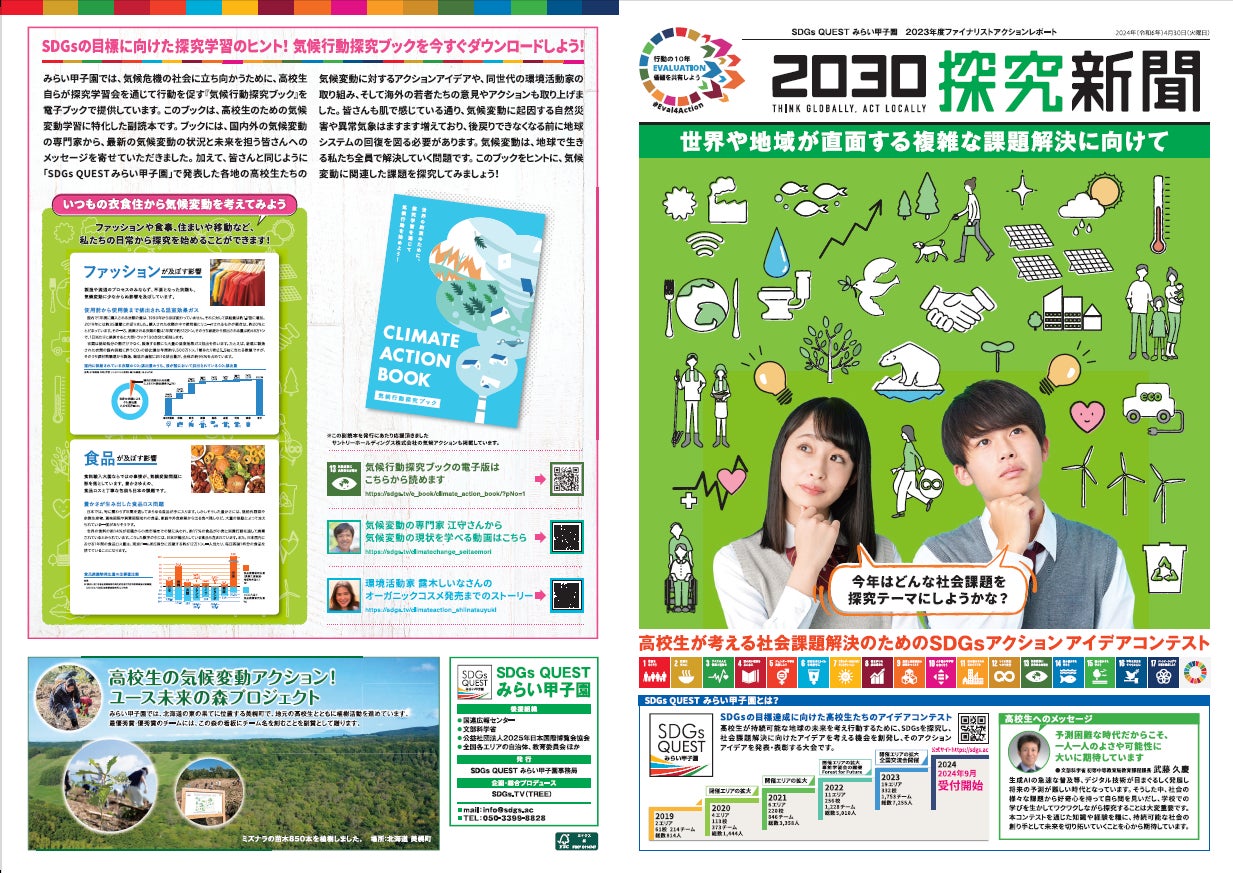 2024年度の開催エリア内の学校に向けて、みらい甲子園受賞アクション普及啓発広報媒体「2030探究新聞」を発行しています。「2030探究新聞」は、2023年度に各エリアで開催された大会の最優秀・優秀賞チームのアクションアイデアなどを紹介し、高校生たちの大会参加へのきっかけ作りやアイデア創出の参考になることを目的にしています。