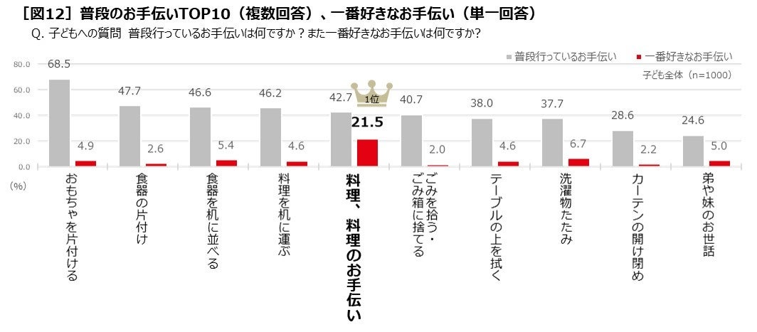 子どもが普段するお手伝いは「おもちゃの片付け」だが、一番好きなお手伝いは「料理・料理のお手伝い」