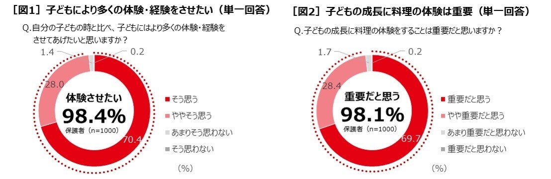 保護者の98.4%が「子どもにはより多くの体験・経験をさせてあげたい」、98.1%が「子どもの成長に料理の体験は重要」。