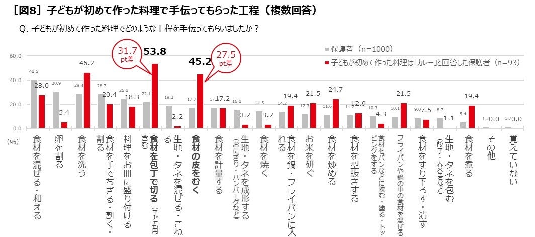 一方、子どもが初めて作った料理が「カレー」の場合、「食材を包丁で切る(子ども用含む)」(53.8%)が最も多く、次いで「食材を洗う」(46.2%)、「食材の皮をむく」(45.2%)の順となっています。カレーを作る場合、ほかの料理(全体)と比べてより高度な工程を手伝ってもらう傾向があり、「食材を包丁で切る」は全体22.1%に対しカレー53.8%と31.7ポイント、「食材の皮をむく」は全体17.7%に対しカレー45.2%と27.5ポイントもの差が見られました[図8]。