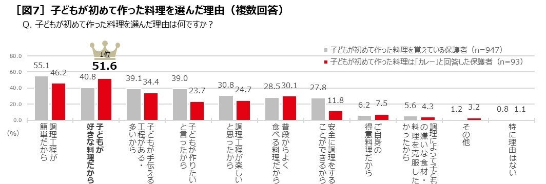 前述図6で子どもが初めて作った料理を覚えていると答えた保護者947人に、子どもが初めて作った料理を選んだ理由を聞きました。すると、全体では「調理工程が簡単だから」(55.1%)が最も高く、次いで「子どもが好きな料理だから」(40.8%)、「子どもが手伝える工程がある・多いから」(39.1%)、「子どもが作りたいと言ったから」(39.0%)などが挙げられました。一方、子どもが初めて作った料理が「カレー」と答えた保護者では、「調理工程が簡単だから」(46.2%)より「子どもが好きな料理だから」(51.6%)と答えた人の方が多くなっています[図7]。