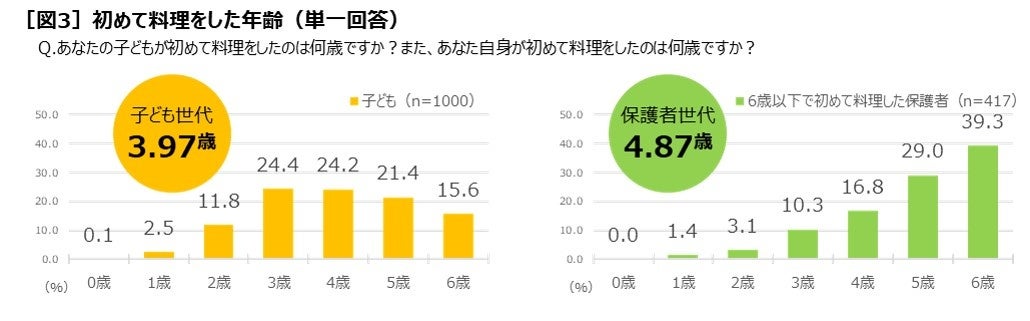 子どもが初めて料理をした年齢は平均3.97歳。保護者が初めて料理をした年齢は平均4.87歳。今の子どもの方が初めて料理をするタイミングが早期化しているという結果に。