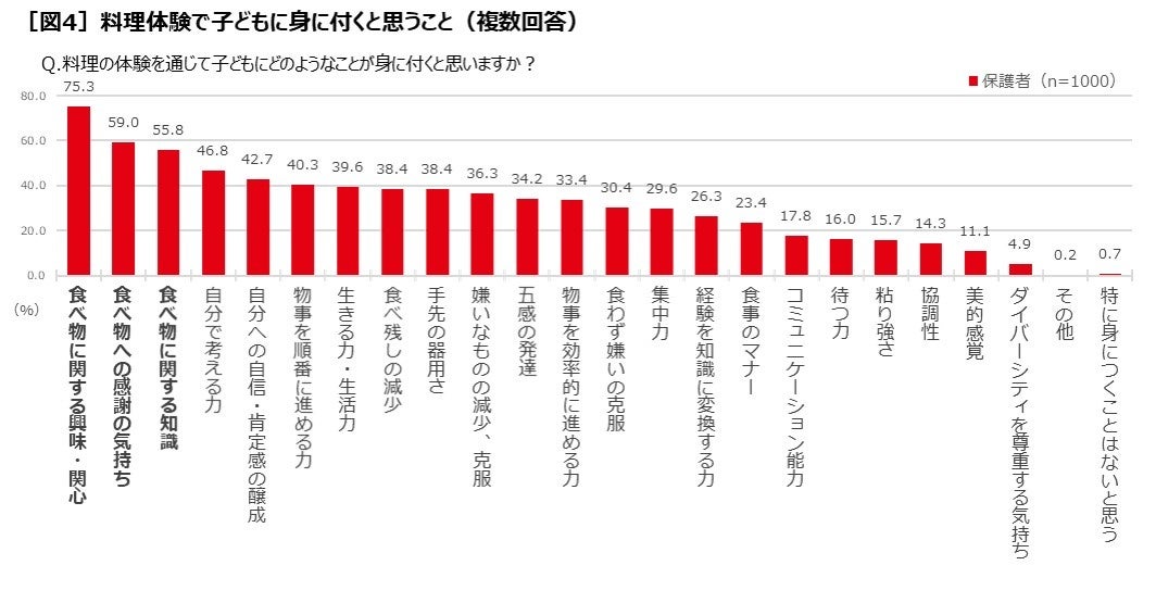 保護者に、料理体験を通じて子どもに身に付くと思うことを聞くと、「食べ物に関する興味・関心」(75.3%)、「食べ物への感謝の気持ち」(59.0%)、「食べ物に関する知識」(55.8%)など、食に関することが上位に挙げられました。また、およそ半数が「自分で考える力」(46.8%)を挙げ、約4割が「自分への自信・肯定感の醸成」(42.7%)、「物事を順番に進める力」(40.3%)、「生きる力・生活力」(39.6%)を挙げていることから、子ども自身の成長も期待していることが分かります[図4]。