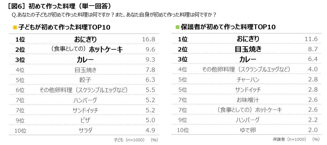 保護者に子どもが初めて作った料理を聞くと、1位「おにぎり」(16.8%)、2位「(食事としての)ホットケーキ」(9.6%)、3位「カレー」(9.3%)の順となりました。また、保護者自身が子どもの頃に初めて作った料理は、「おにぎり」(11.6%)、「目玉焼き」(8.7%)、「カレー」(6.4%)の順であり、おにぎりとカレーは時代が変わっても不動の人気を誇る初めて料理の定番となっていることが分かりました[図6]。